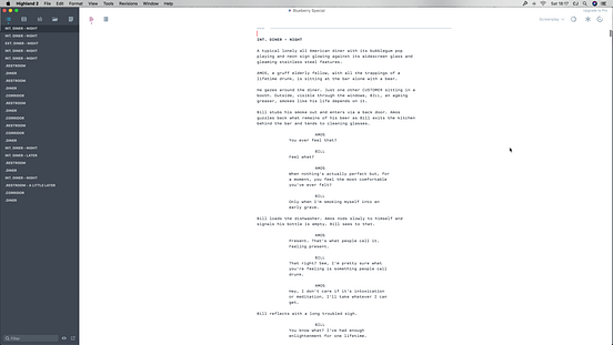 So, what’s the catch, you might be asking? Well, Highland 2 is currently only available for MacOS which means you need to invest in a machine just as sleek and sexy as the software to use it… unless you’re willing to build a hackintosh that is. Good news if you’ve already got a MacBook but certainly not a good enough reason to switch over if you haven’t. The editor also doesn’t quite perfectly show how your lines will break when exported to pdf and there’s no real snapshot/versioning system for scene drafts. Oh, and there isn’t an iOS app yet either so no jumping on your iPad to continue working.